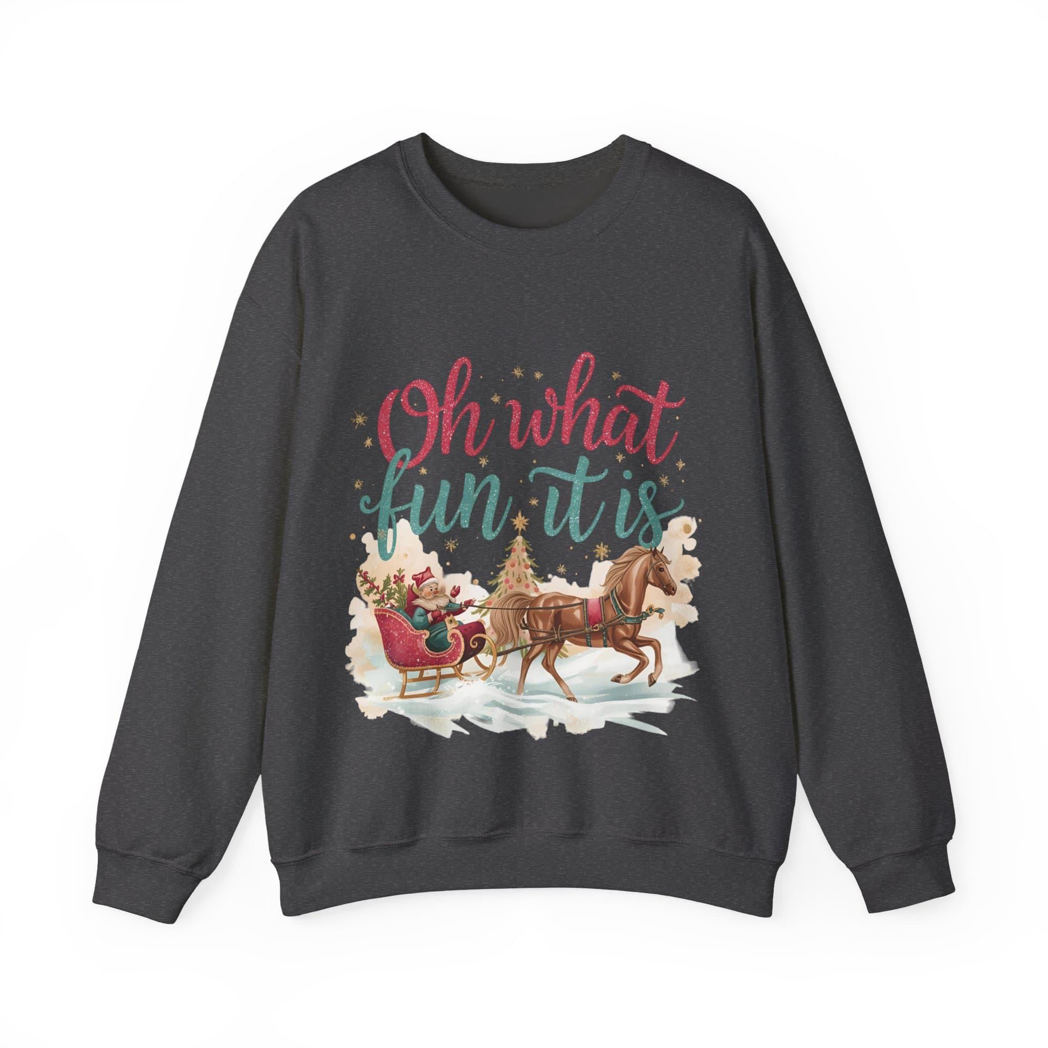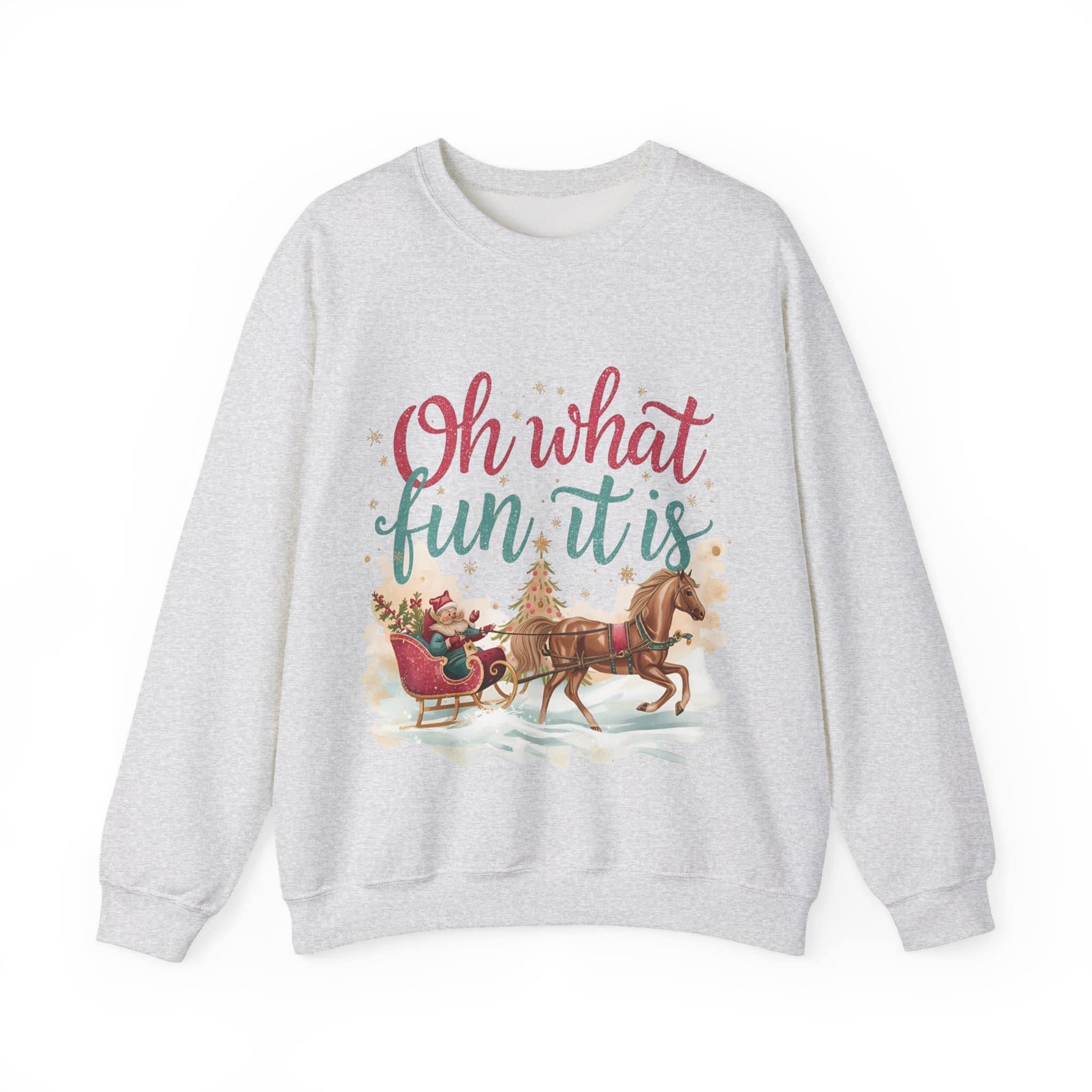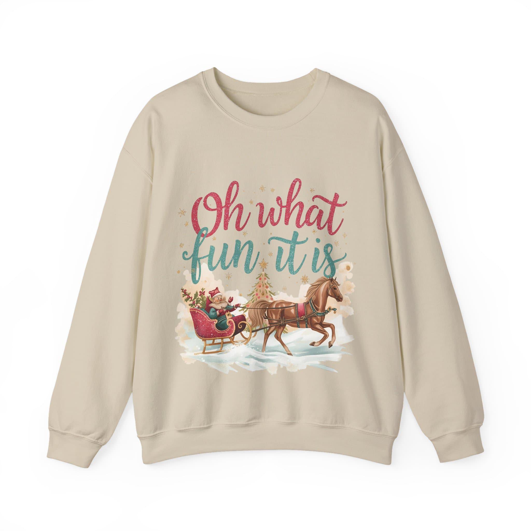 Bring the joy of Jingle Bells to life with this darling “Oh What Fun It Is” sweatshirt — featuring a vintage-style horse and sleigh illustration with glittery teal, red, and gold details. It’s festive, feminine, and just sparkly enough to make spirits bright!