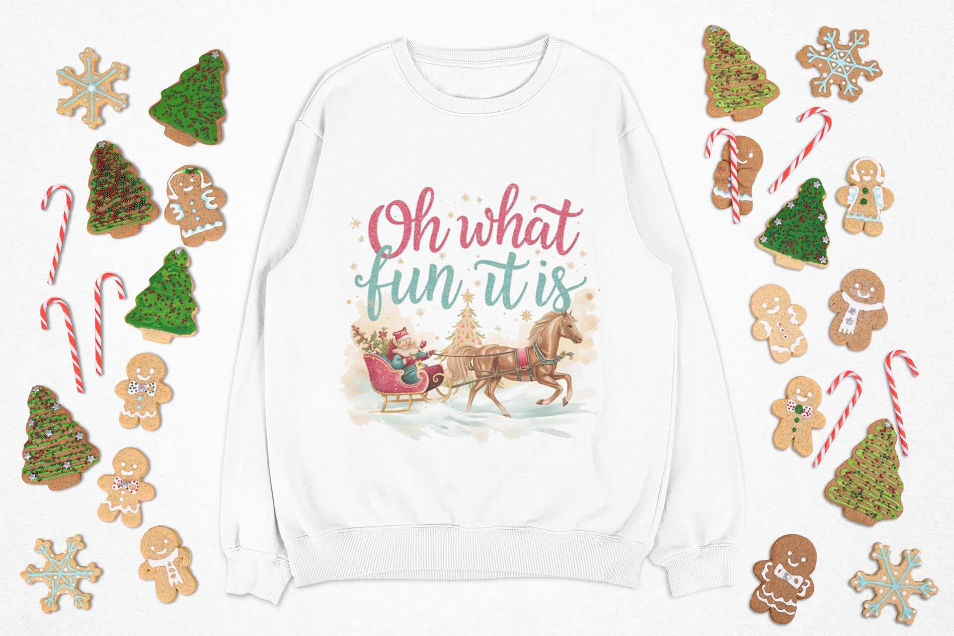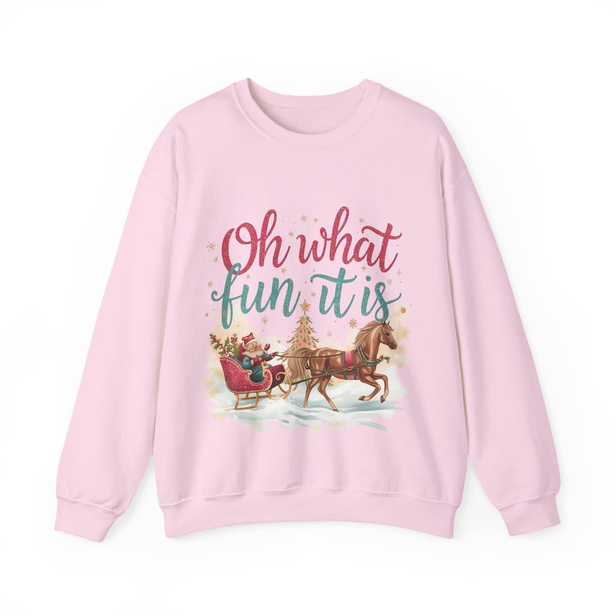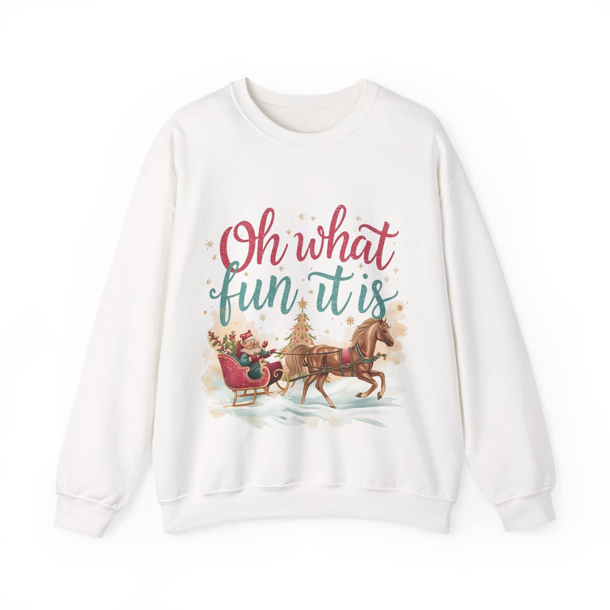 Bring the joy of Jingle Bells to life with this darling “Oh What Fun It Is” sweatshirt — featuring a vintage-style horse and sleigh illustration with glittery teal, red, and gold details. It’s festive, feminine, and just sparkly enough to make spirits bright!
