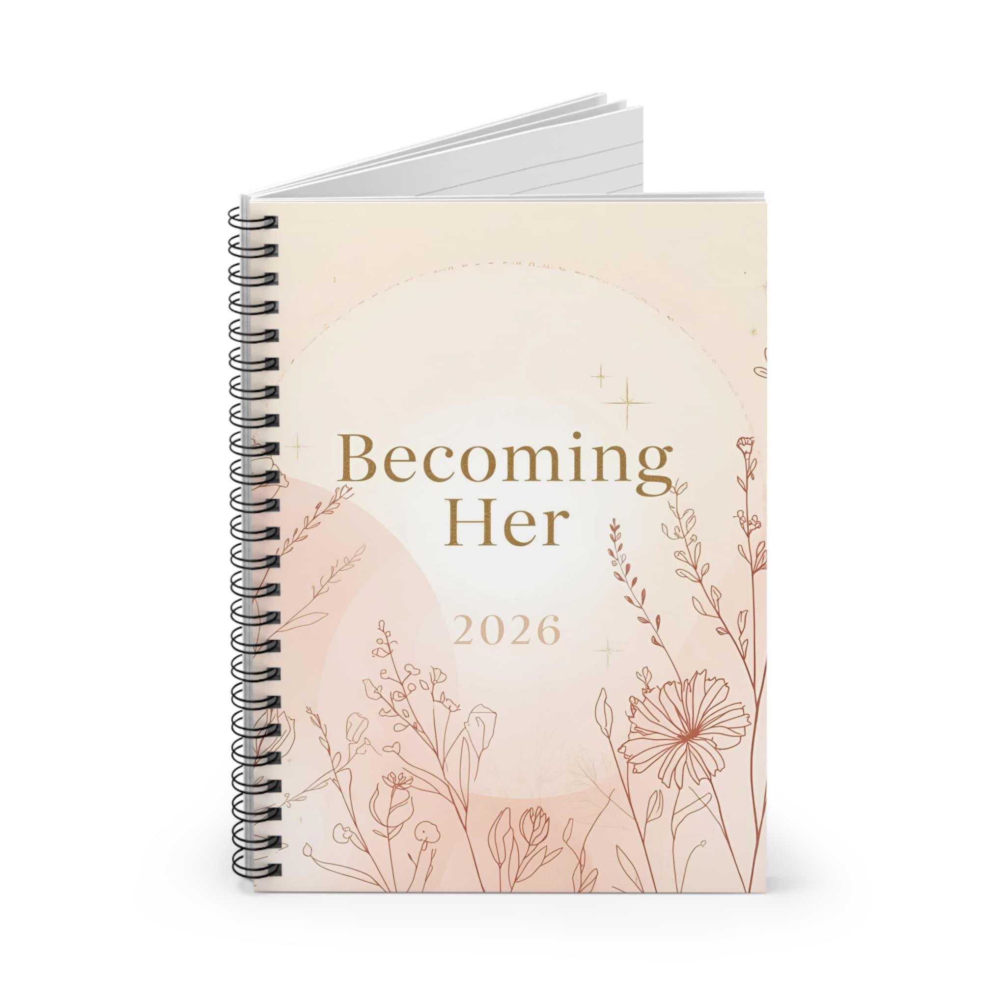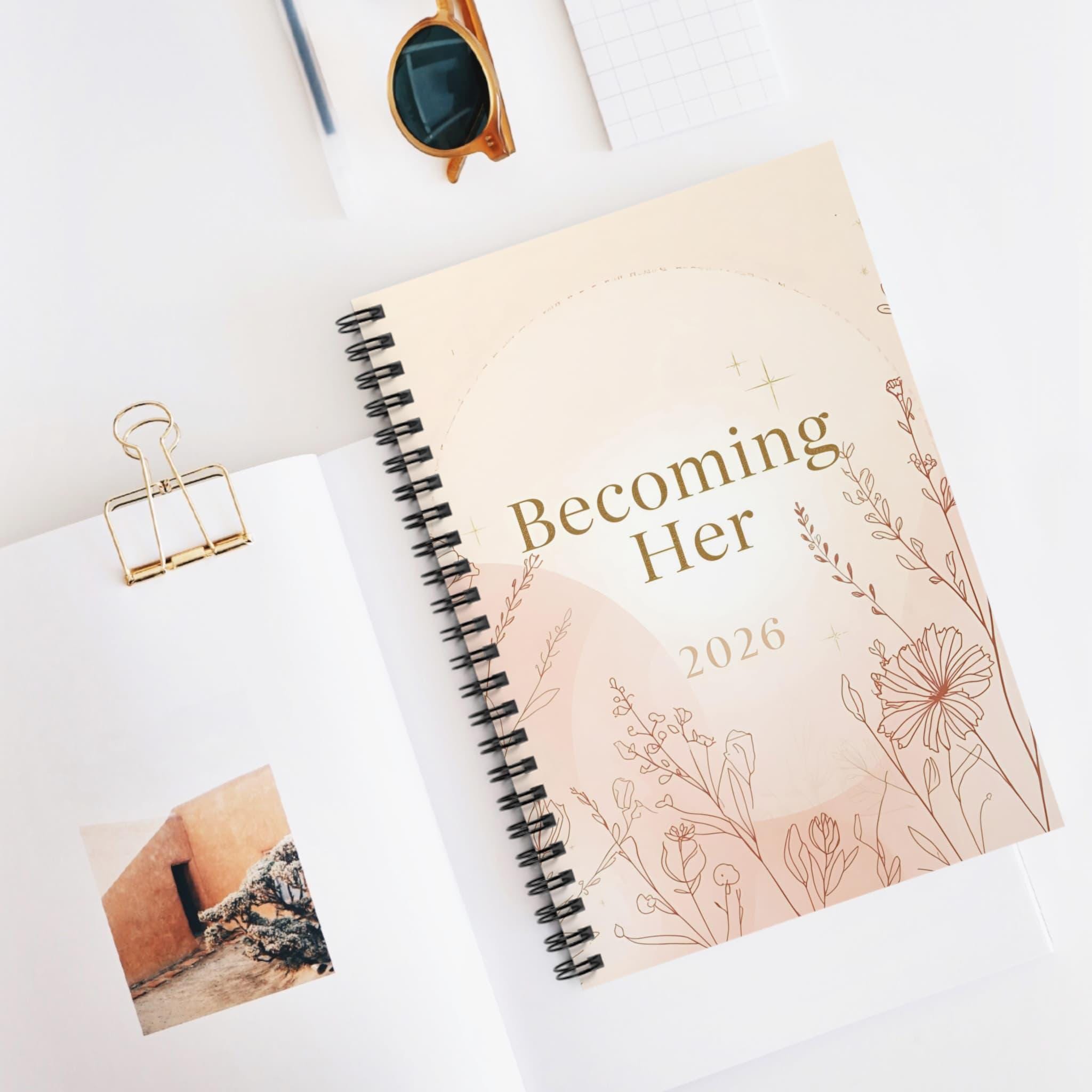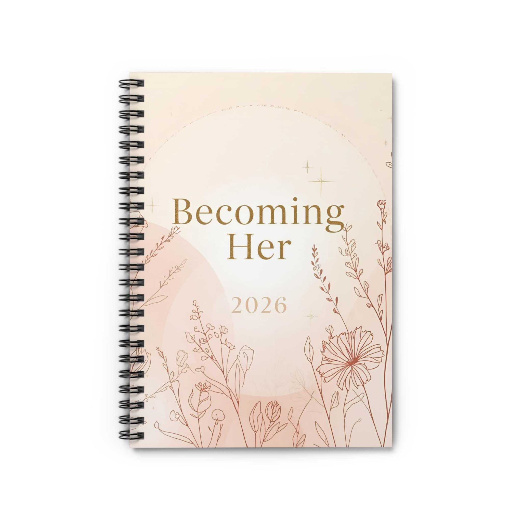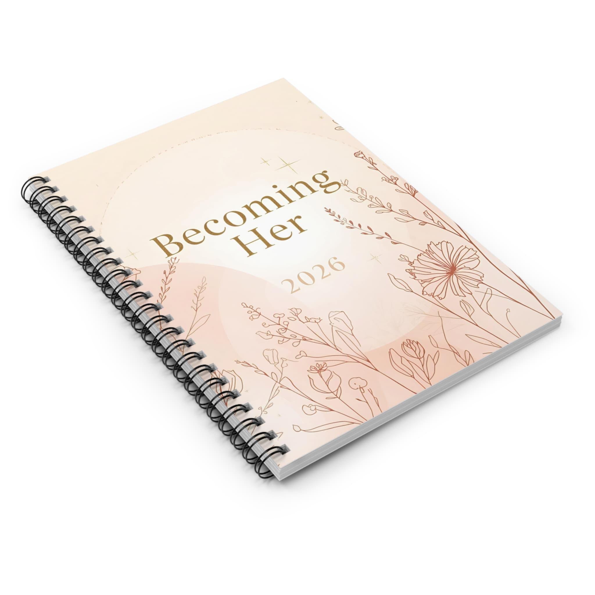 A soft, reflective spiral notebook designed for everyday journaling, planning, and quiet goal-setting. The warm blush cover features delicate floral line art and the words “Becoming Her 2026,” inviting thoughtful entries and gentle intentions. Its metal spiral lies flat for easy writing, and a handy pocket inside the back cover keeps notes, receipts, or mementos close. Compact and lightweight at 6" x 8", it slips into a tote or bedside stack so you can capture ideas, milestones, and morning pages wherever you are.
