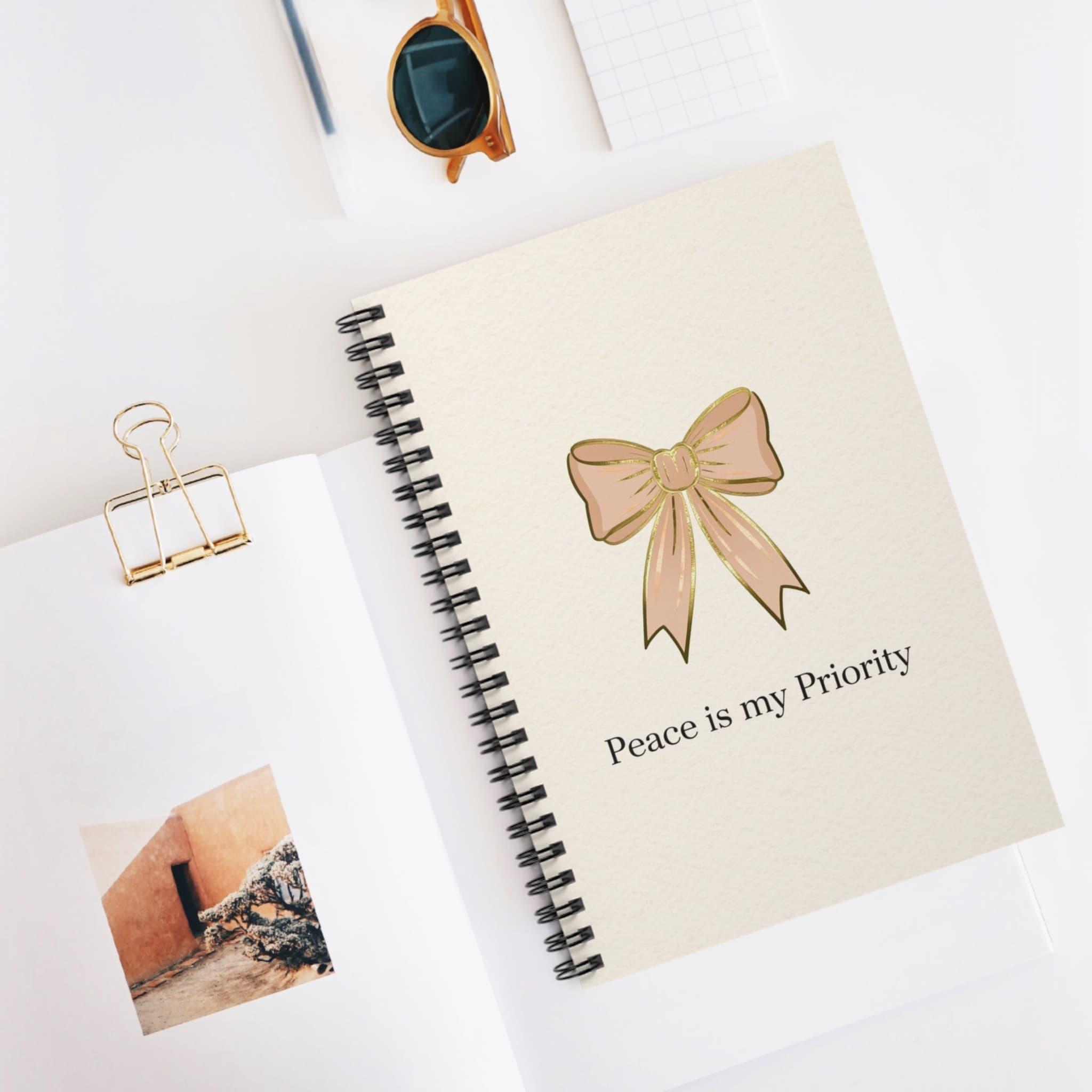 Soft, calm, and intentionally simple — this spiral notebook invites quiet moments of thought. The front shows a gentle gold-pink bow above the words “Peace is my Priority,” setting a mindful tone before you write the first line. Inside, smooth ruled pages make journaling, lists, and gentle planning feel effortless. A neutral back cover and metal spiral give it a tidy, slightly elegant finish, while the inner document pocket keeps receipts, notes, or mementos tucked away. Carry it to morning coffee, a therapy session, or your bedside; it’s built to support slow, steady reflection and everyday organization.