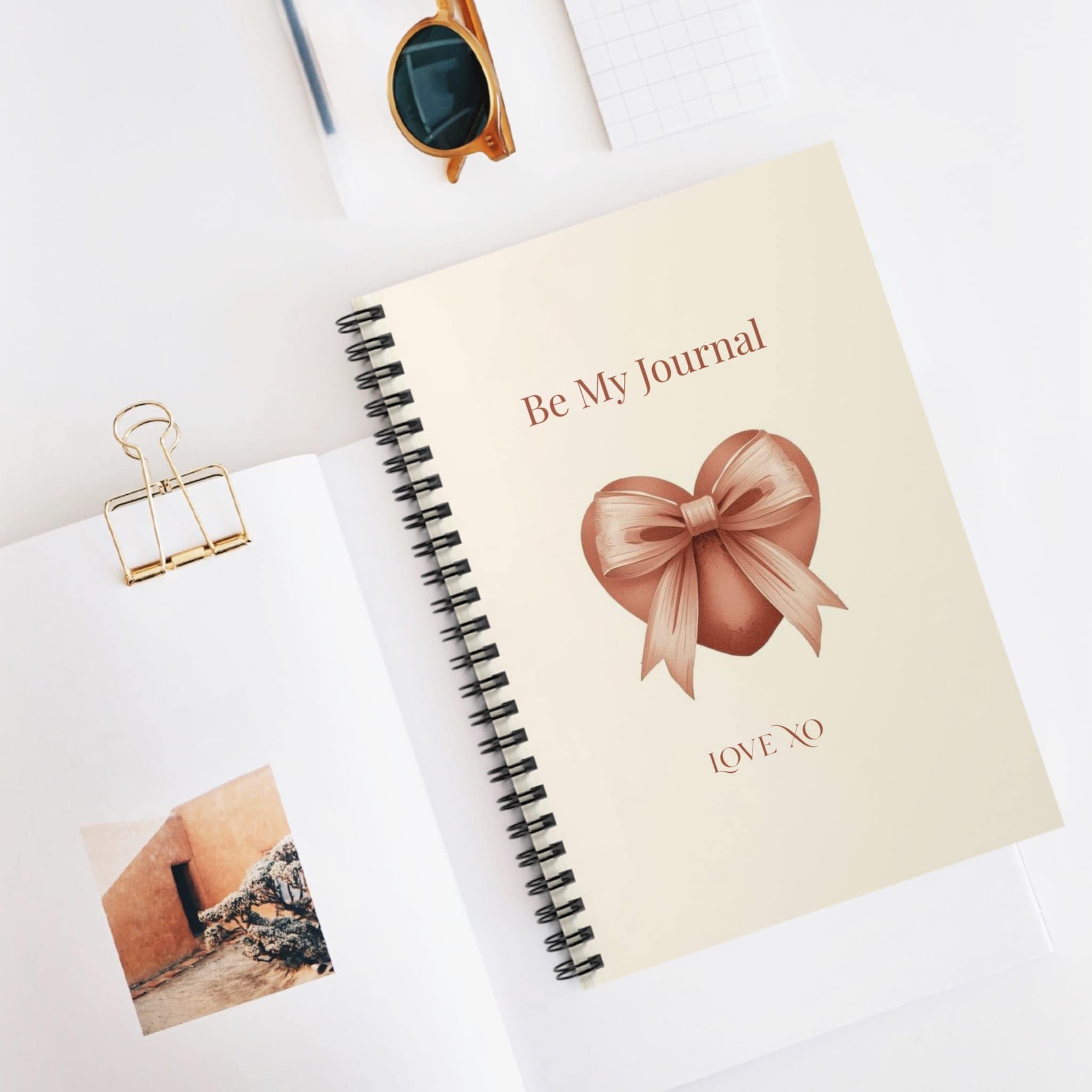 Soft cream cover, a satin-heart illustration, and the gentle prompt “Be My Journal” invite slow mornings and honest pages. This ruled spiral notebook sits open on a lap or a café table, ready for lists, letters, memory-keeping, or quiet reflections.