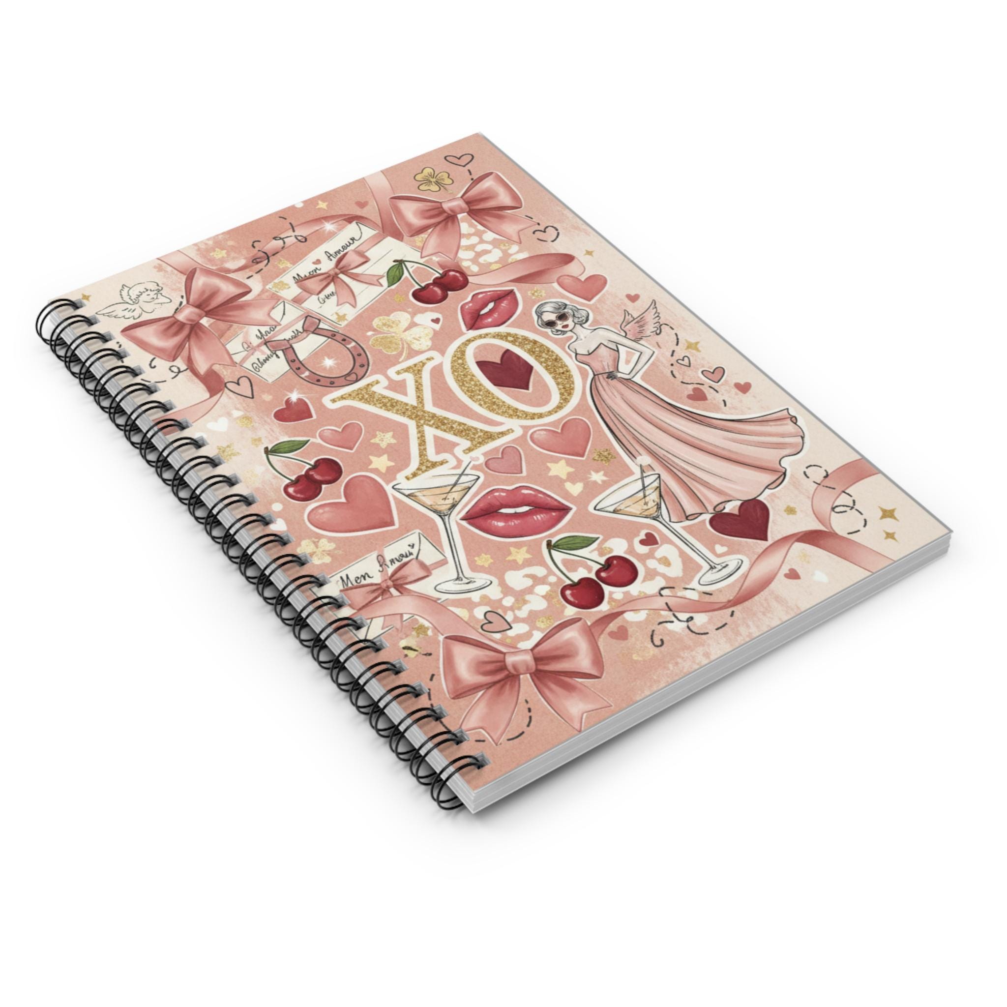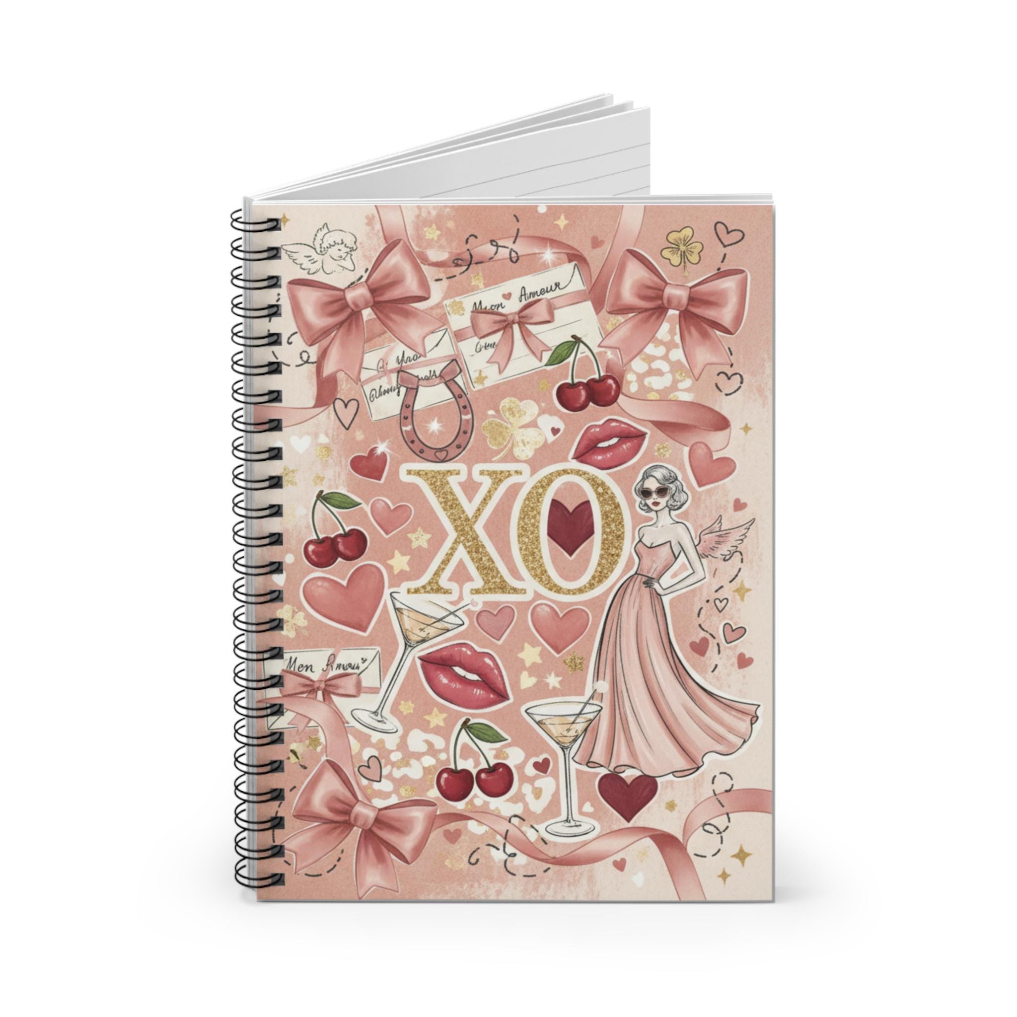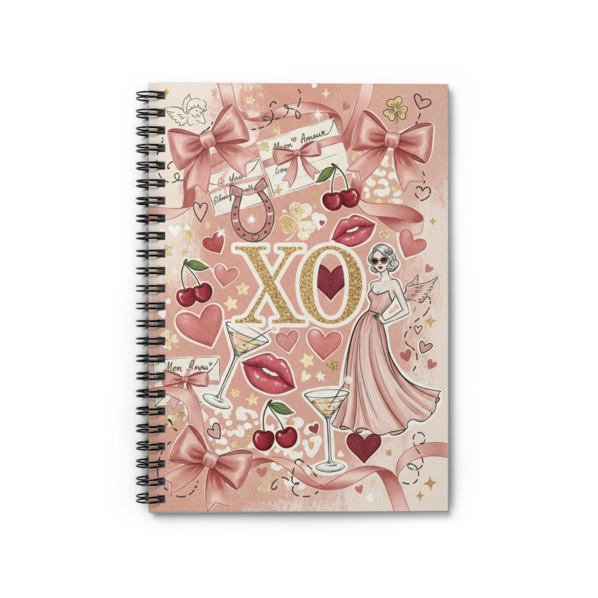 A blush-pink spiral notebook that feels like a page from a vintage love letter. "All the things I love" is Illustrated with playful retro icons—bows, cherries, martini glasses, lips, and a chic dress figure—this ruled notebook invites quick notes, doodles, and everyday lists with a touch of glam. The metal spiral lies flat for easy writing and the inner document pocket keeps loose mementos or receipts safe. Carry it in a tote for coffee-shop journaling, tuck it into a desk drawer for plan-making, or use it as a cheerful companion for creative bursts.