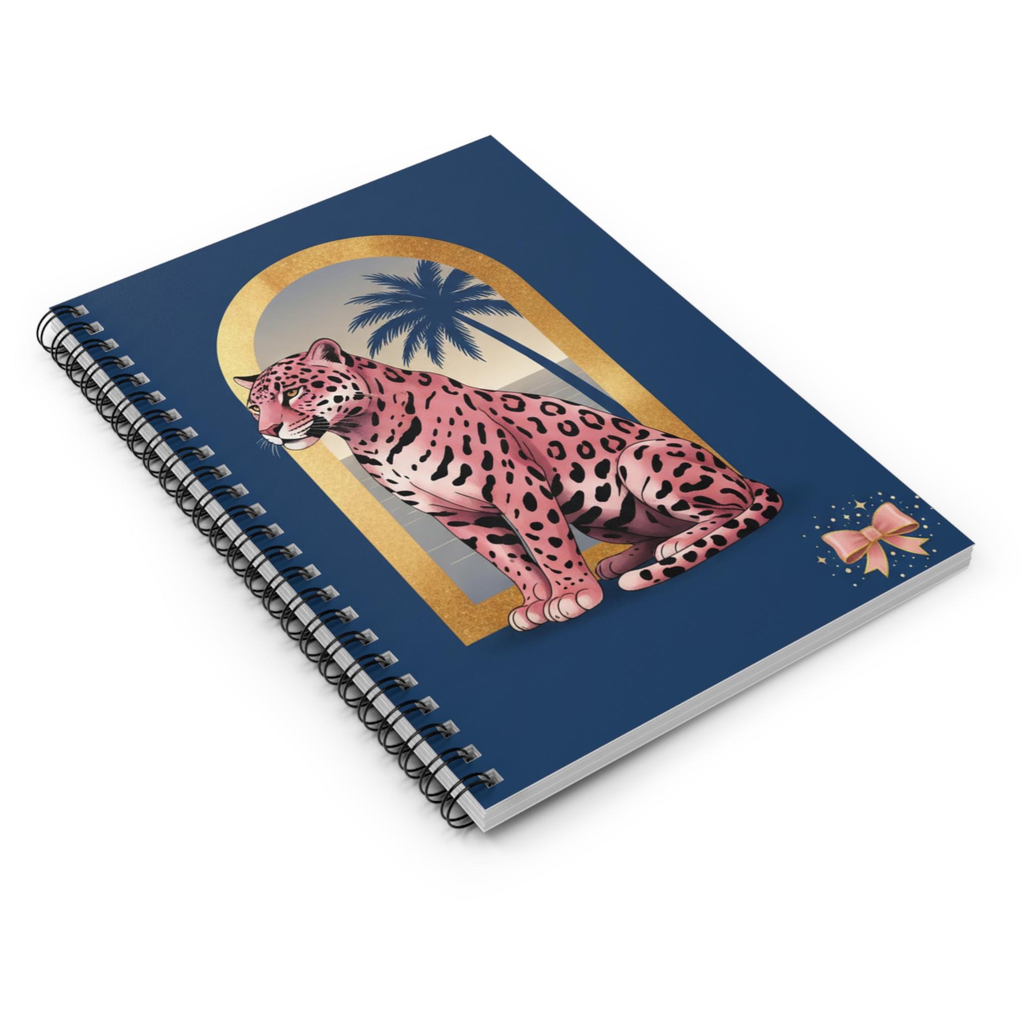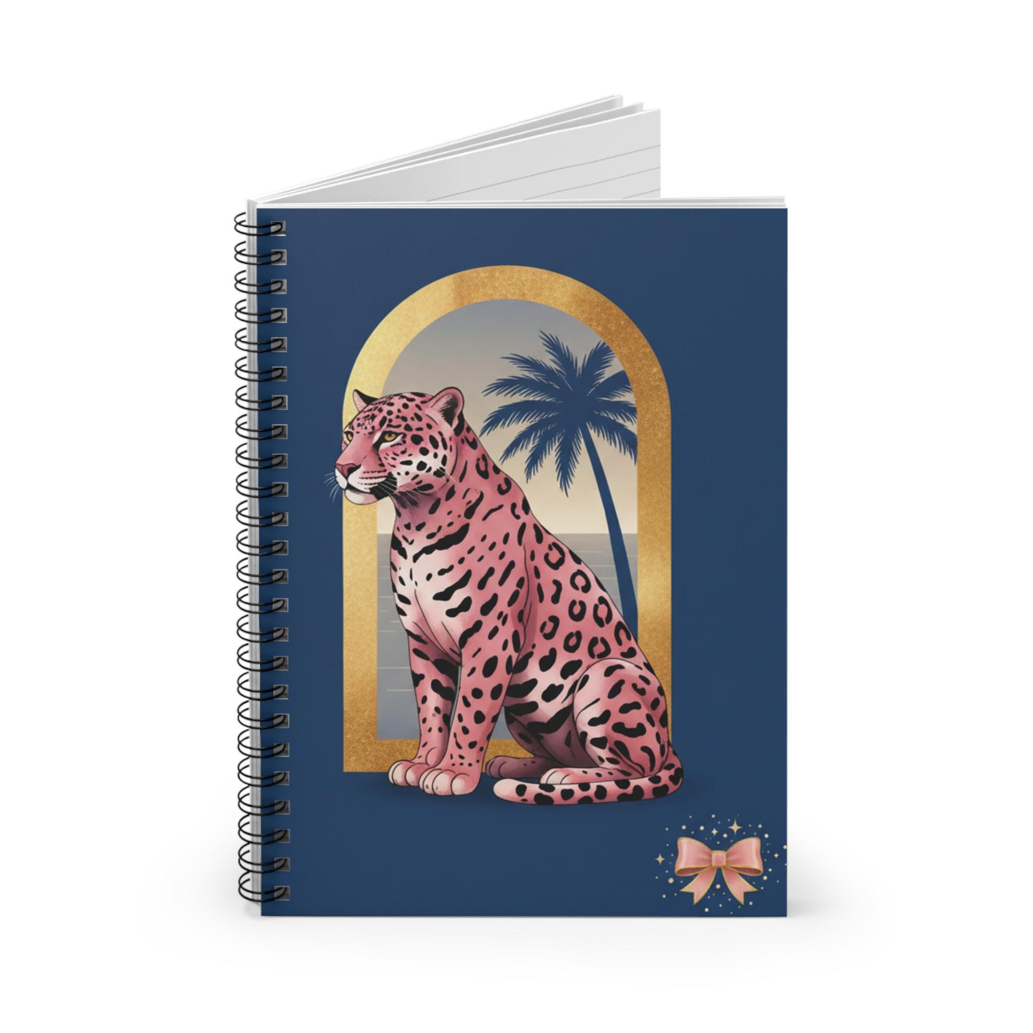A compact ruled spiral notebook with a bold, artistic cover that brings a playful, vintage-meets-tropical vibe to everyday note-taking. The deep blue cover features a stylized pink-spotted leopard seated before a stone arched window framing a palm silhouette and soft golden sky—small details like a pink bow add a whimsical touch. Inside, smooth 90gsm ruled pages give a satisfying glide for pens and pencils, while a sturdy metal spiral lets the notebook fold flat or shed pages cleanly. A back document pocket keeps receipts or loose notes secure. Sized to slip into backpacks and tote bags, this notebook feels personal and thoughtfully made for jotting ideas, lists, and little moments of creativity.