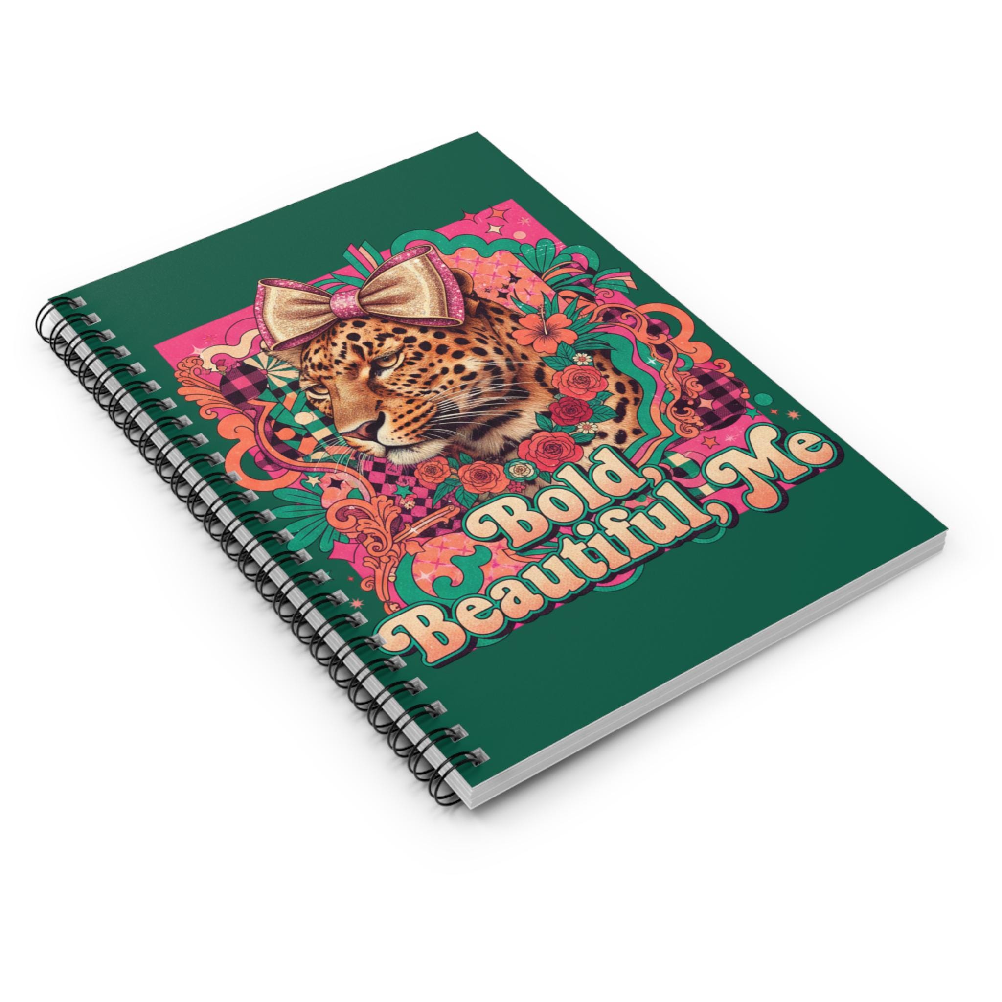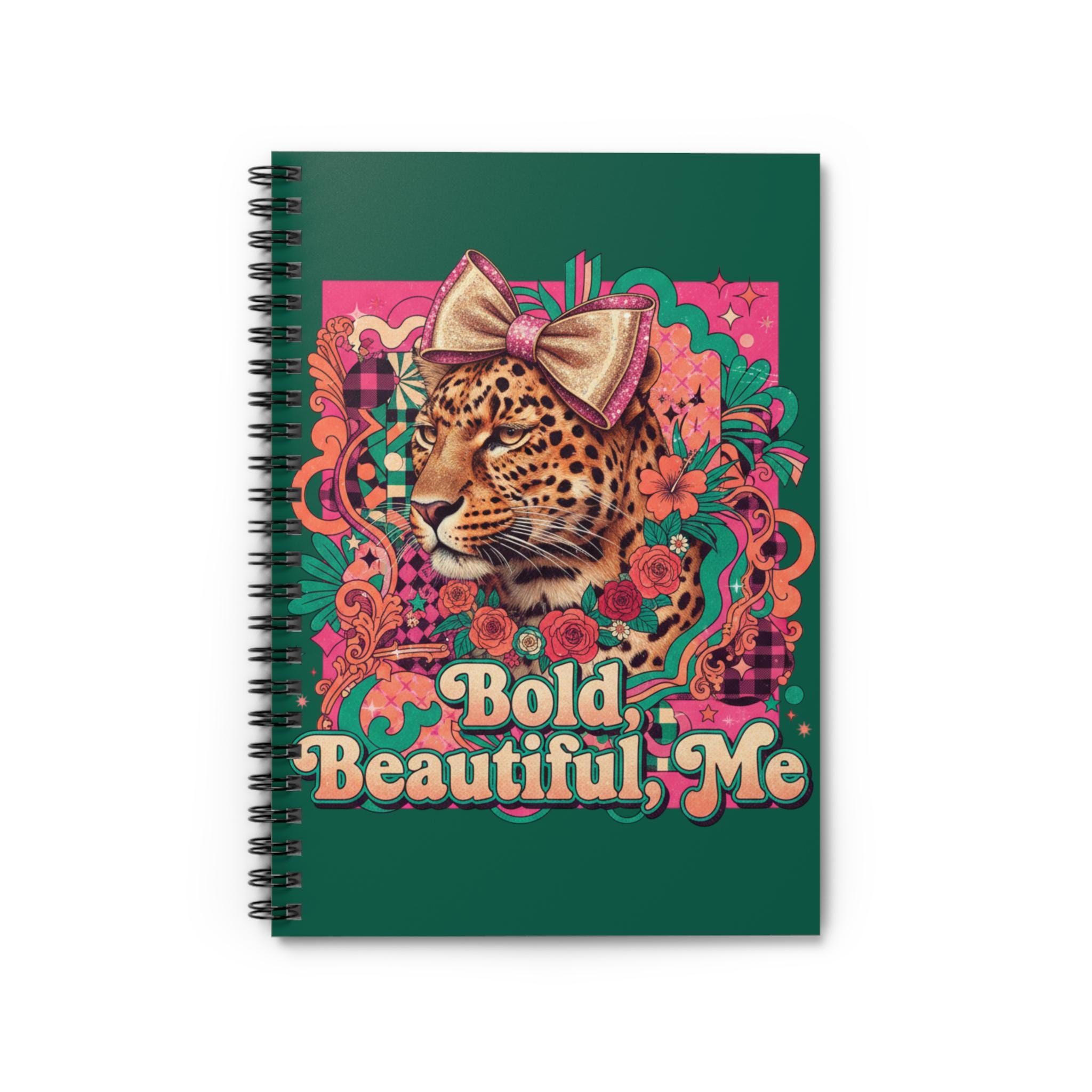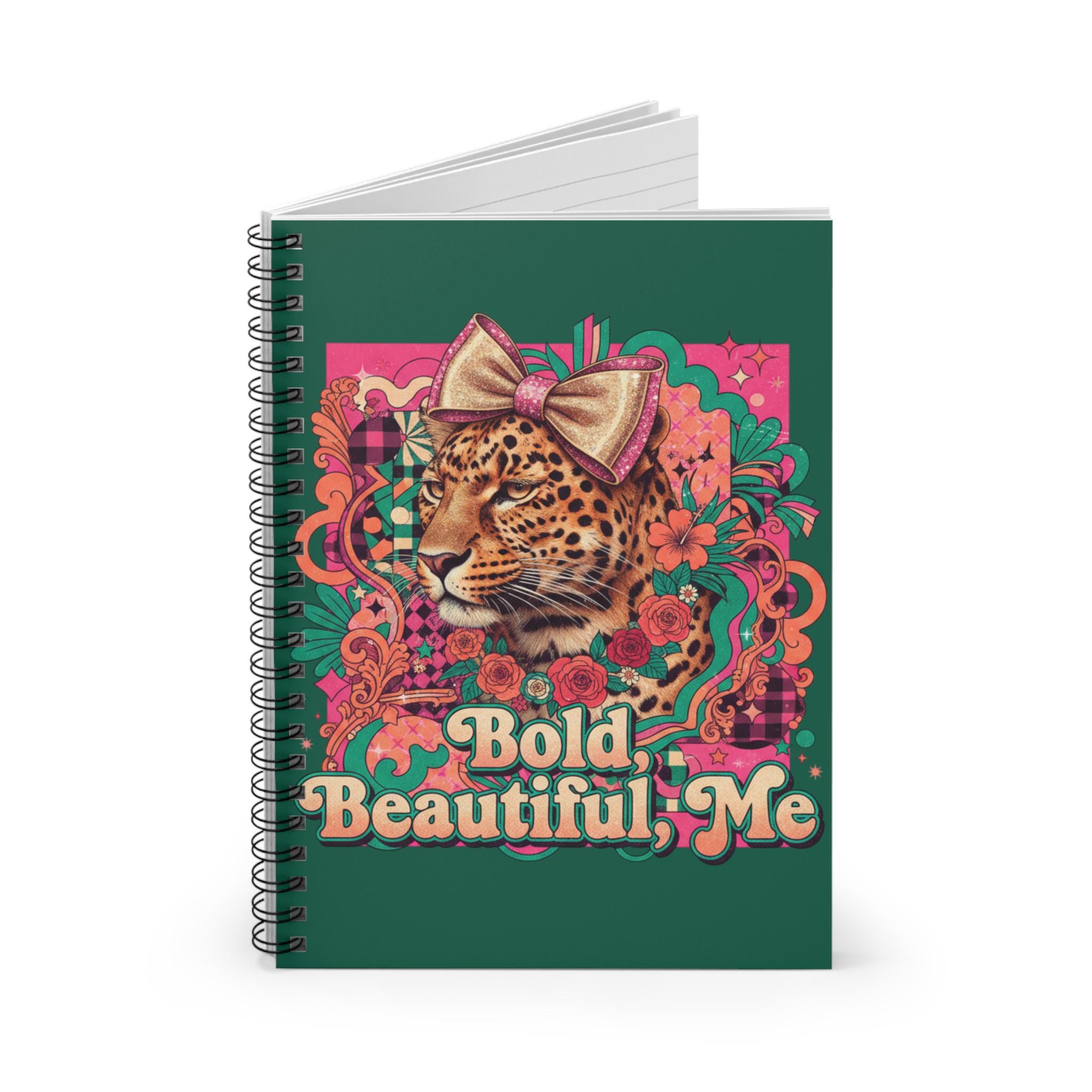 This ruled spiral notebook carries a playful, confident spirit. The cover art — a leopard crowned with a bow amid vibrant florals and retro lettering that reads “Bold, Beautiful, Me” — invites bold thoughts and honest journaling. Its 6" x 8" size slips into bags easily for notes on the go, while the sturdy 350 gsm covers protect 118 ruled pages (90 gsm) that take pens and pencils smoothly. A metal spiral lets pages lie flat or be removed cleanly, and an inner document pocket keeps receipts, stickers, or loose ideas tucked safely away. Use it for daily reflections, creative lists, study notes, or planning the next bright idea.