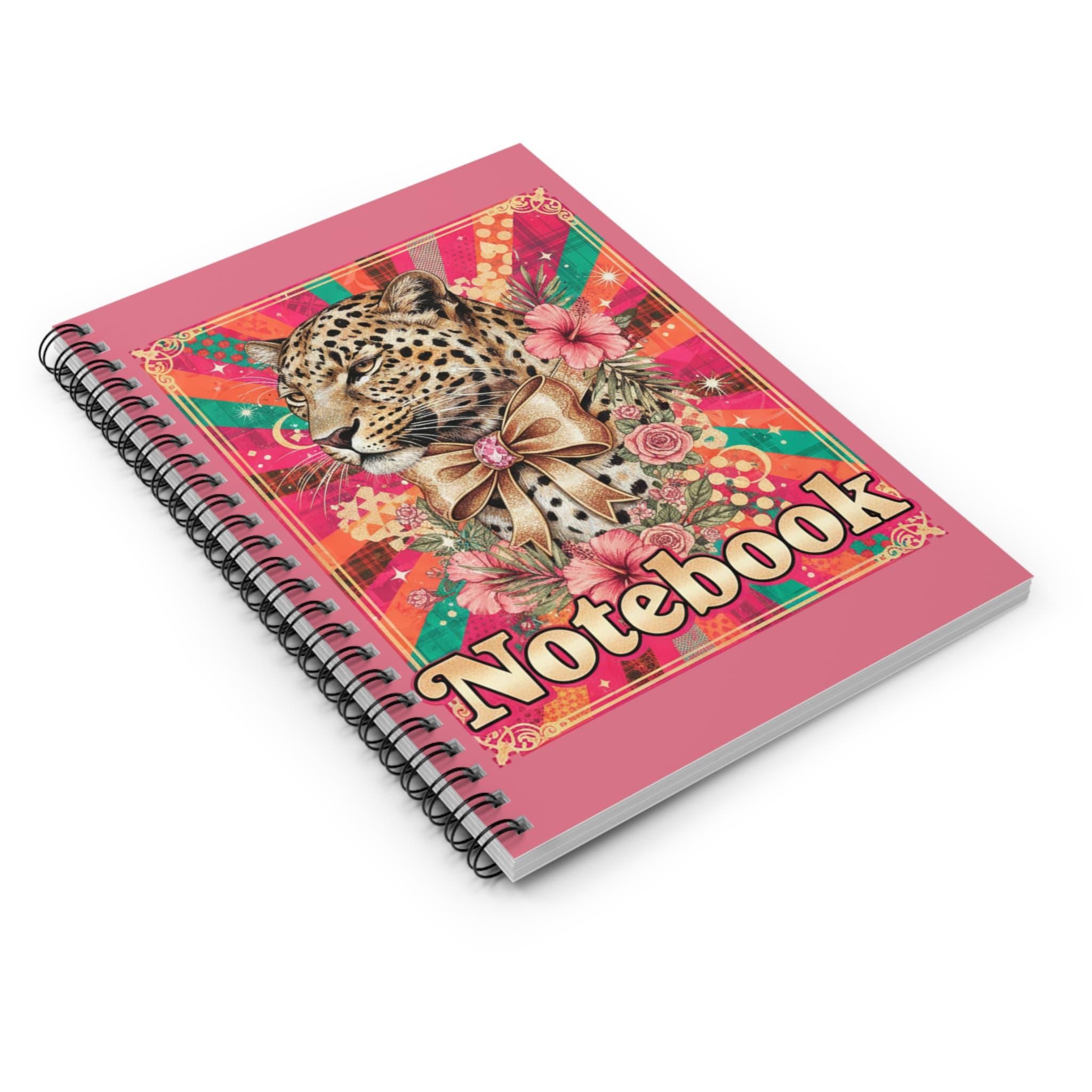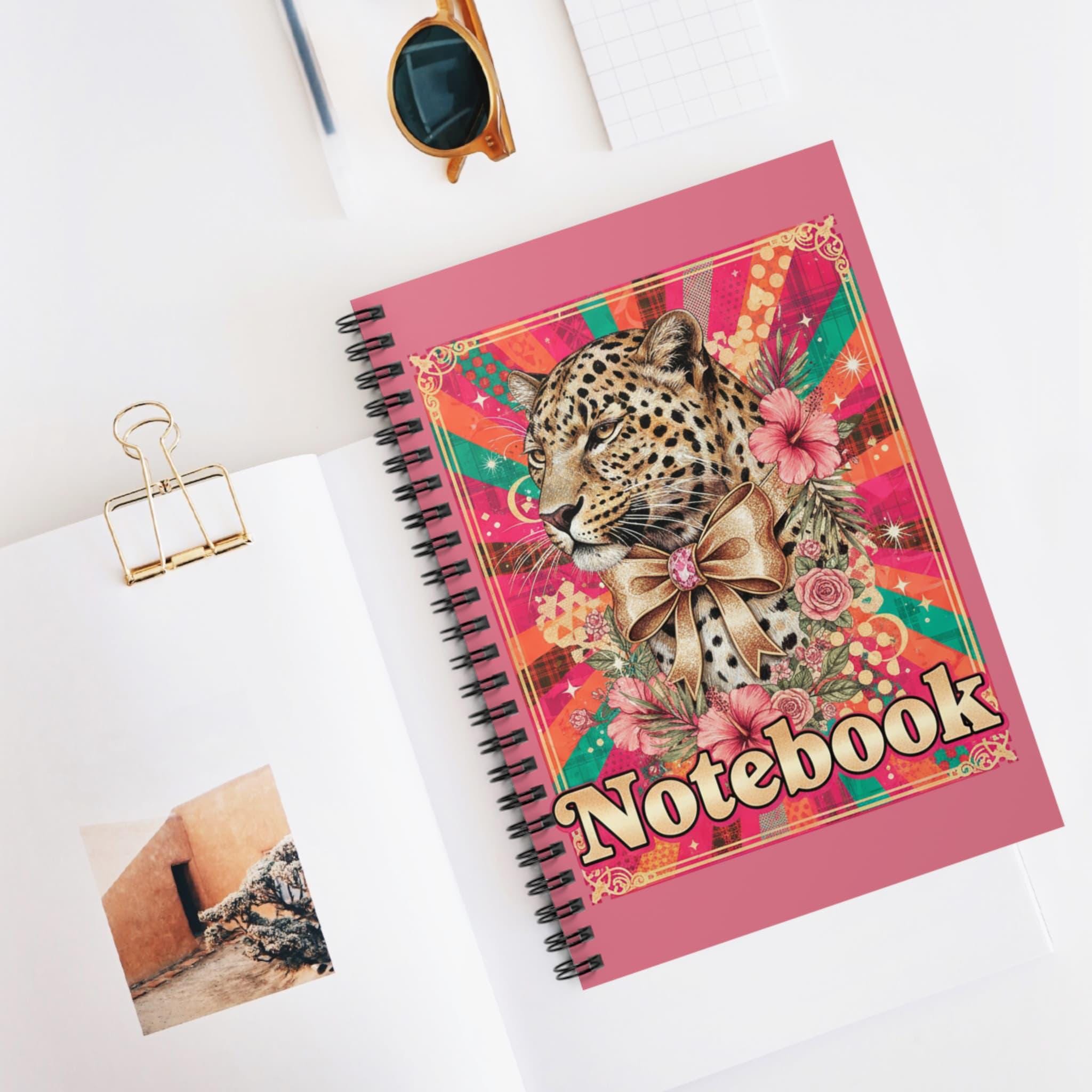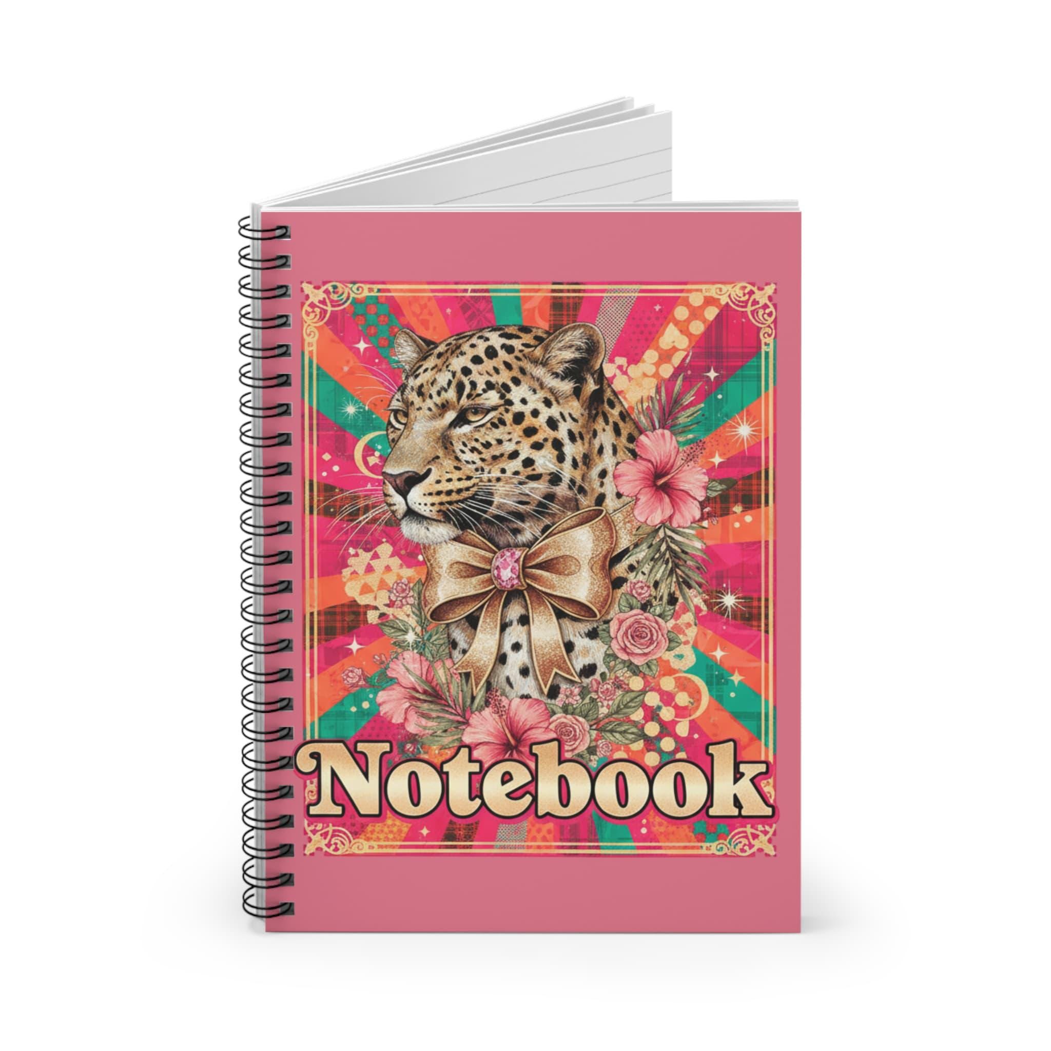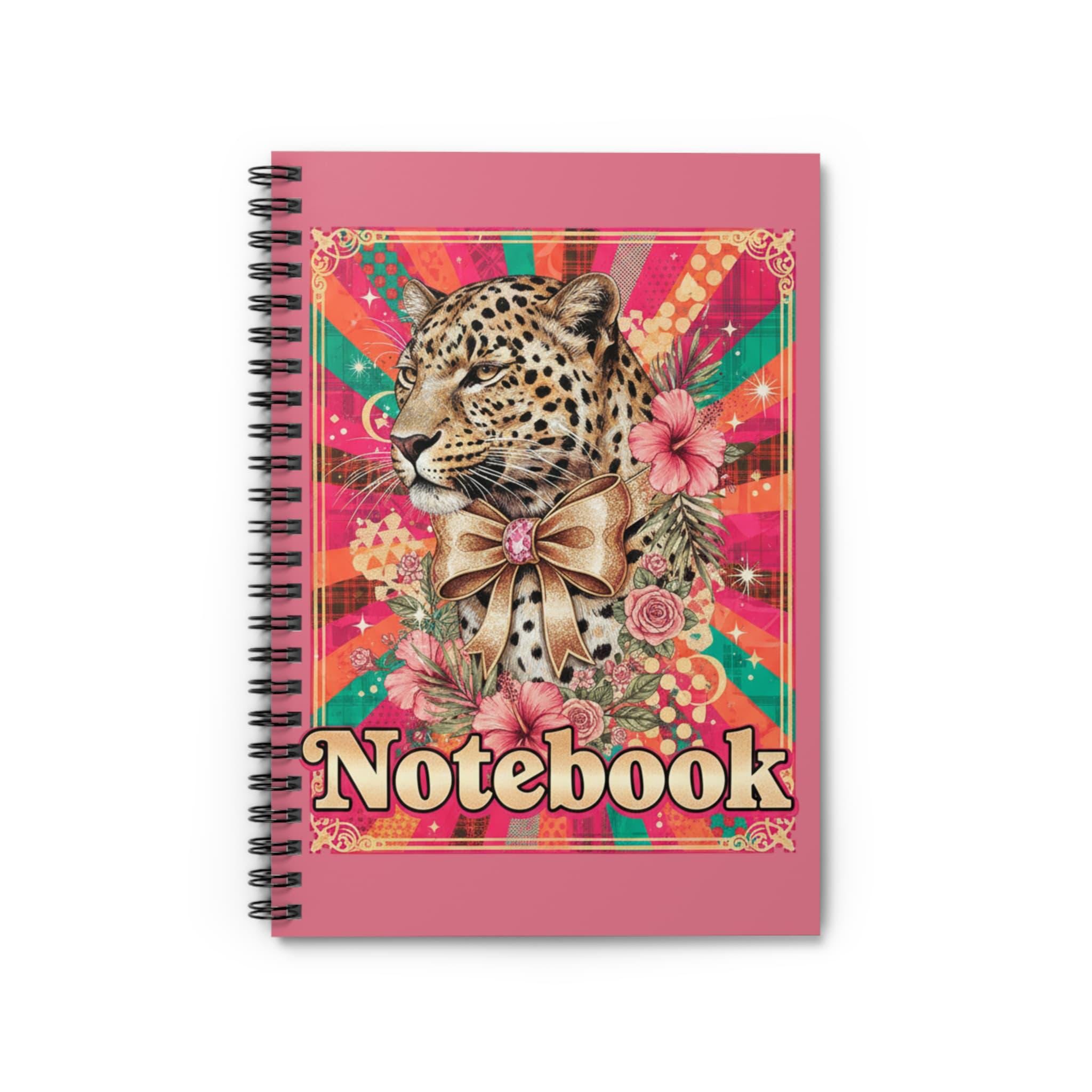 This vibrant spiral notebook brings bold, retro flair to everyday notes. The front cover features a regal leopard framed by tropical blossoms, a decorative bow, and sunburst rays in warm coral, teal, and gold accents. Inside, 118 ruled pages of smooth 90gsm paper make handwriting glide while keeping lines neat. A dark grey back cover and a metal spiral give durability and easy page turning, and a hidden document pocket in the back keeps loose notes and receipts organized. Compact at 6" x 8", it slips into tote bags and backpacks for on-the-go sketches, journaling, class notes, or to-do lists with a touch of wild style.