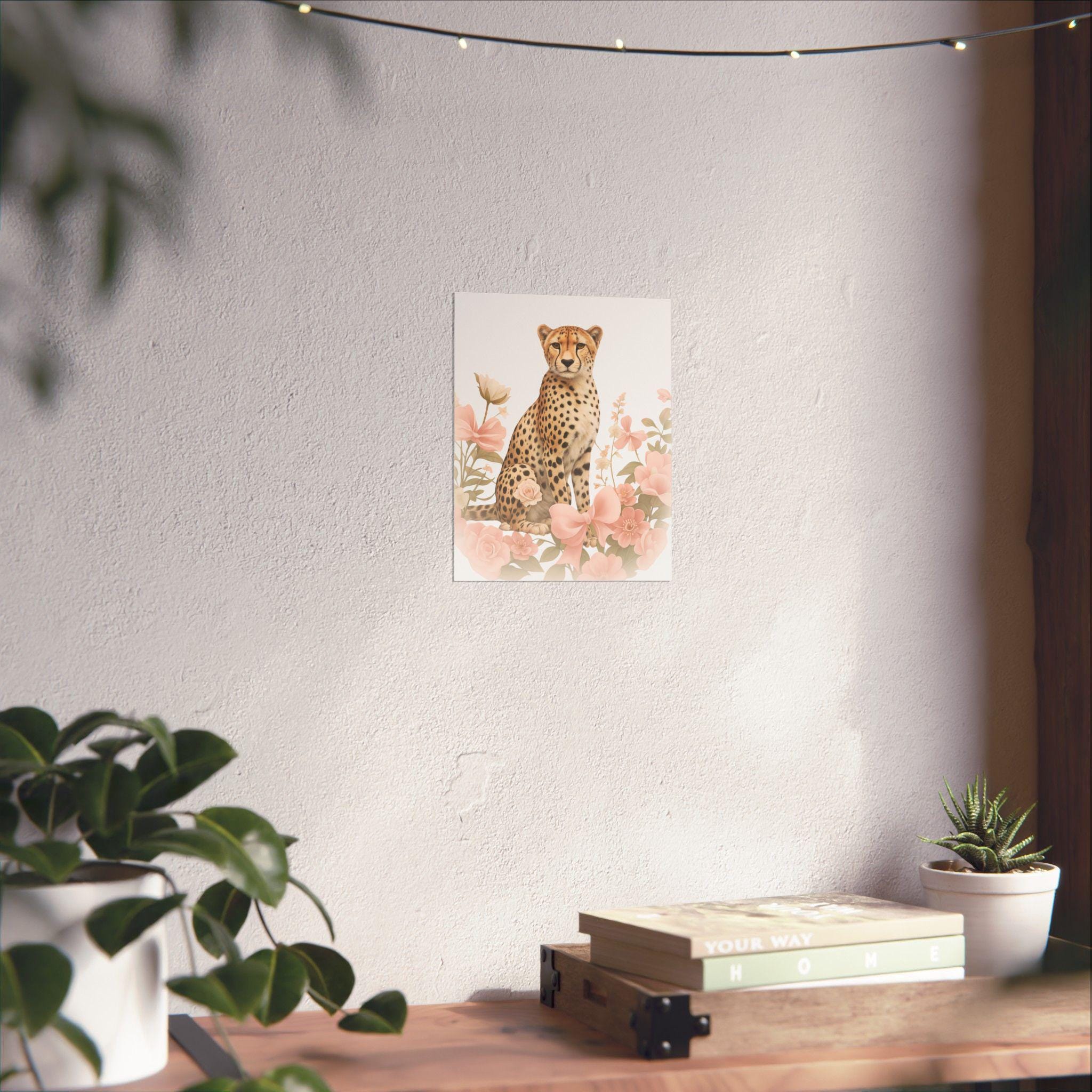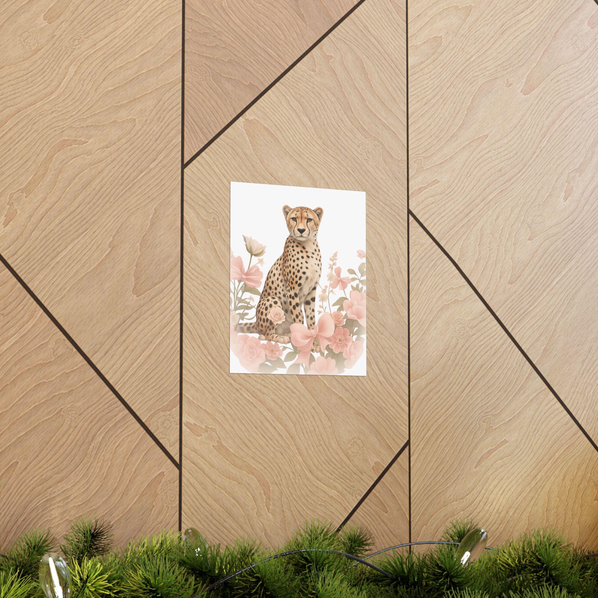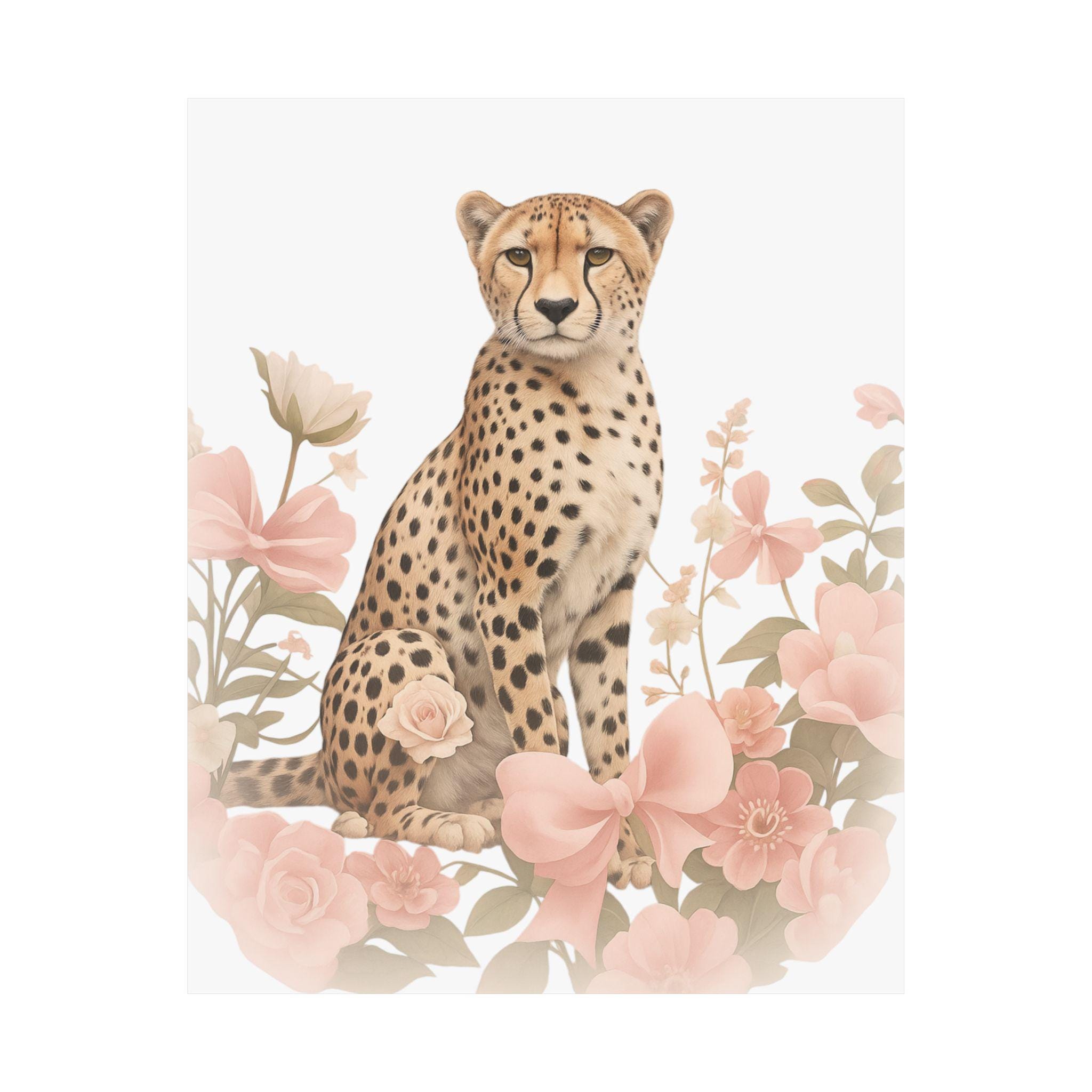 Soft, painterly florals frame a poised cheetah in gentle, sunlit hues. This matte vertical poster brings quiet elegance to nurseries, bedrooms, or cozy reading nooks — a calm focal point that feels both wild and tender. The archival museum-grade paper and vibrant giclée printing keep the delicate pinks and warm tawny tones true over time, while the matte finish removes glare so the artwork reads like a watercolor on the wall. Hang it solo for a subtle statement, or layer with other nature prints to build a soothing, curated corner that welcomes slow mornings and soft light.