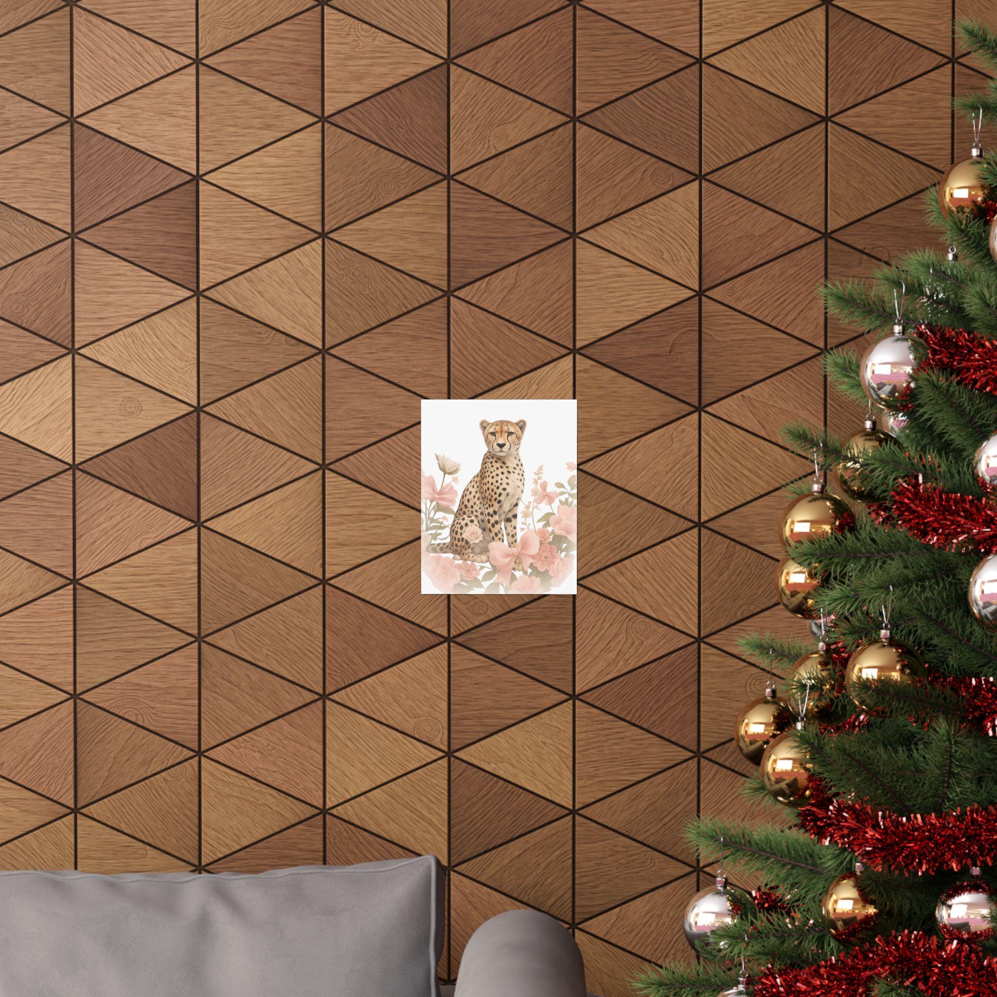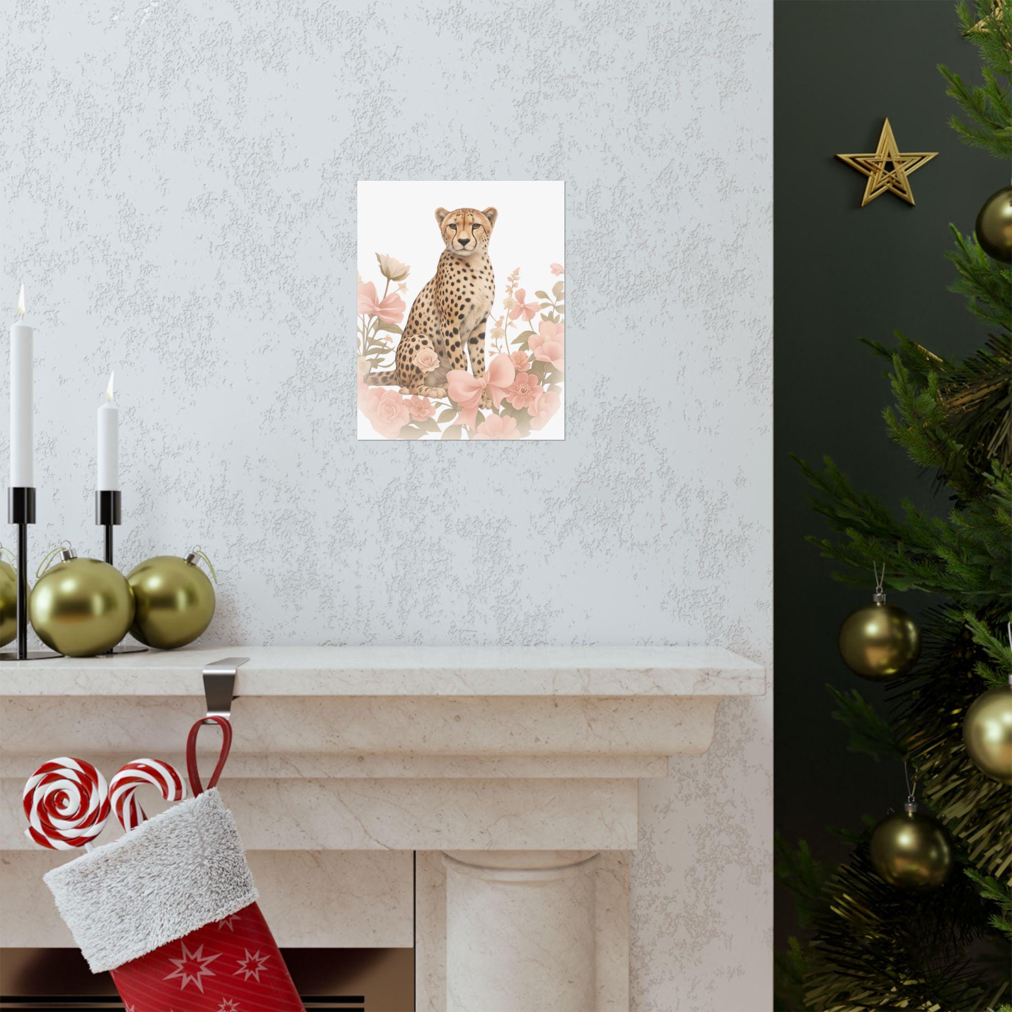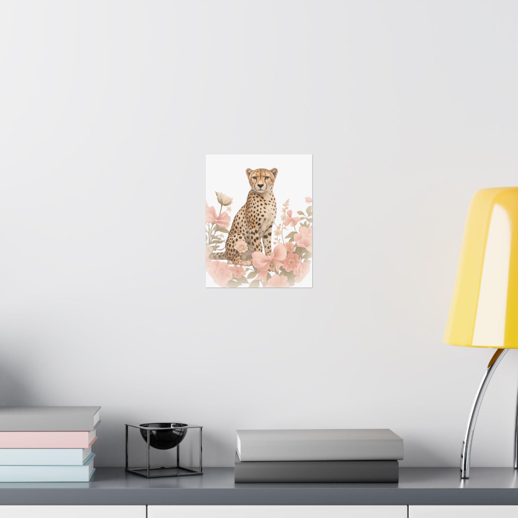 Soft, painterly florals frame a poised cheetah in gentle, sunlit hues. This matte vertical poster brings quiet elegance to nurseries, bedrooms, or cozy reading nooks — a calm focal point that feels both wild and tender. The archival museum-grade paper and vibrant giclée printing keep the delicate pinks and warm tawny tones true over time, while the matte finish removes glare so the artwork reads like a watercolor on the wall. Hang it solo for a subtle statement, or layer with other nature prints to build a soothing, curated corner that welcomes slow mornings and soft light.