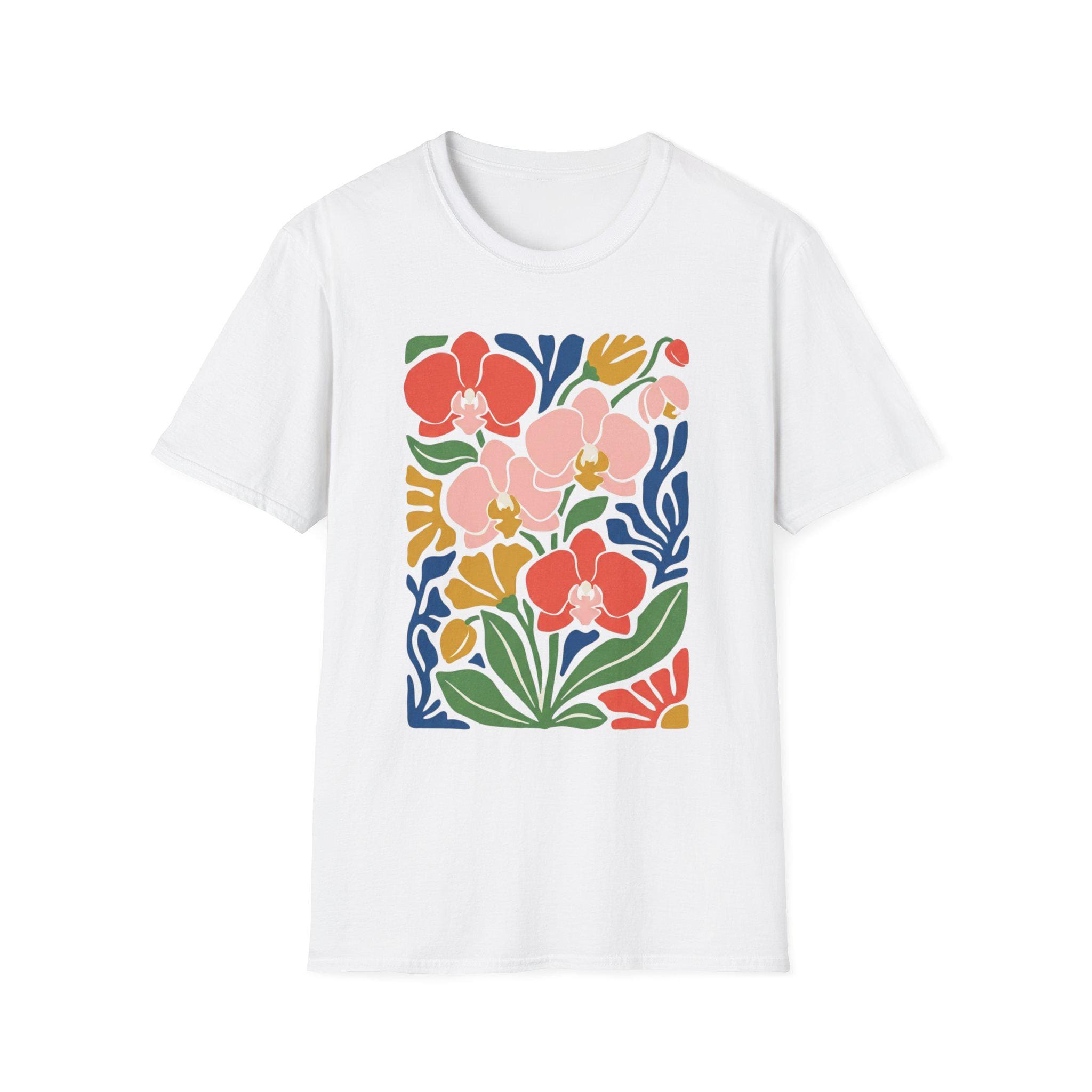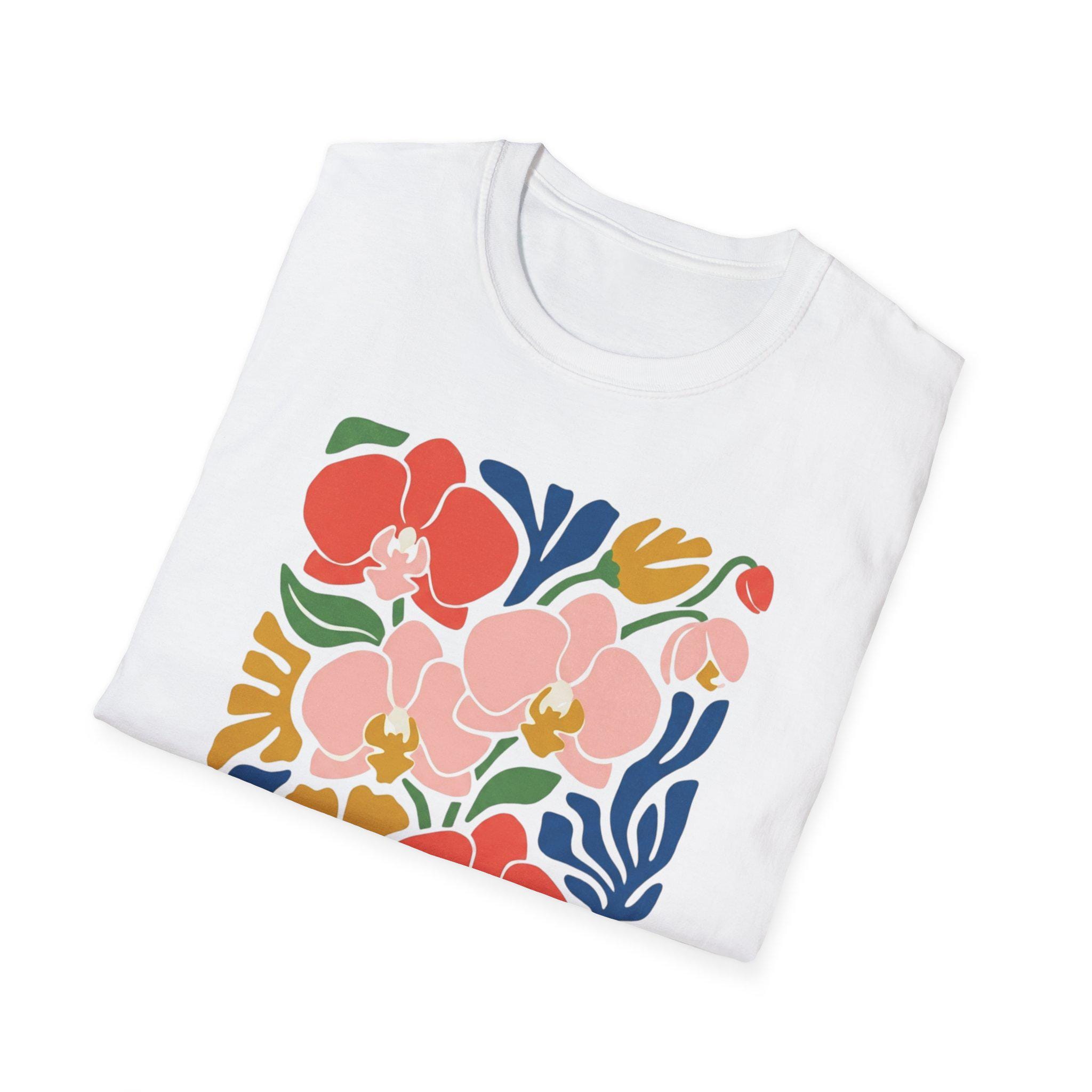 Soft, breezy, and bright — this lightweight cotton tee wears like a well-loved favorite from day one. A bold block of joyful blooms sits at the chest in flat, saturated color: coral and blush orchids framed by leafy greens and navy accents. The vibe is relaxed but refined — the kind of top you reach for when you want an easy pop of color during weekend markets, gallery strolls, or coffee dates. It layers cleanly under a denim jacket or stands alone with high-waisted jeans. Breathable ring-spun cotton keeps you comfortable through warm afternoons and cool nights, while tear-away labeling and a ribbed neckline keep the fit uncluttered and wearable. Made with attention to materials and low-waste construction, this shirt feels thoughtful in both look and make.